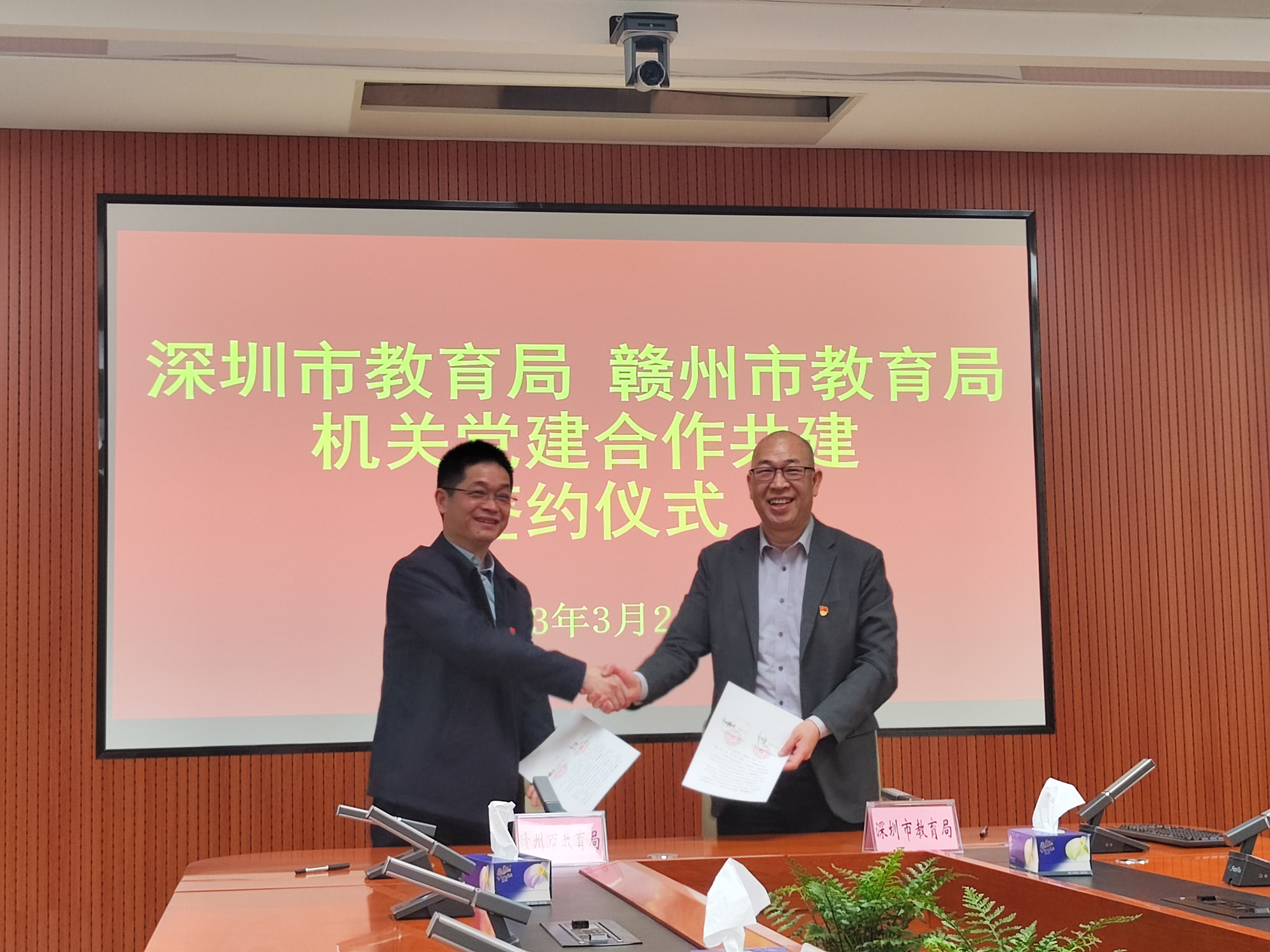 在深圳市教育局,胡敦祥一行与深圳市委教育工委副书记、深圳市教育局机关党委书记杨平及机关党委(人事处)负责同志进行了座谈交流。双方明确,以签约共建为契机,深入贯彻落实《深圳市与365bet体育投_28365-365_365bet娱乐场对口合作实施方案(2023-2027年)》精神,建立机关党建合作共建工作机制,积极开展组织共建、队伍共育、典型共树、履职共促、活动共办、群团共建,提高双方机关党建工作水平。双方商定,将于每年年初进行会商,制订年度合作交流、共建共享计划;充分发挥结对共建双方机关党组织的优势,常态化交流党的组织建设工作经验;组织党员代表在深圳或赣州共同过组织生活,共同开展“三会一课”、党员培训和党日活动;适时组织两地教育系统的优秀党员、先进模范举办座谈会、分享交流会、先进事迹报告会,鼓励两地党员创先争优,发挥先锋模范作用;发挥共建平台优势,携手研究两地教育发展需求、教育改革等课题,加强沟通合作,促进信息互通、工作互信、发展互利、成果共享。同时,双方明确,赣州方面将充分发挥红色资源优势,为深圳市教育局机关和直属单位党员干部来赣州开展革命传统教育和红色研学活动提供必要的支持和帮助;深圳方面将充分发挥地处我国改革开放最前沿优势,为365bet体育投_28365-365_365bet娱乐场教育局机关和直属单位党员干部到深圳参观考察和学习培训提供必要的支持和帮助。