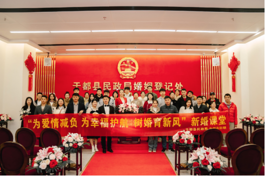 于都县举办以“为爱情减负 为幸福护航 树婚育新风”为主题的集体颁证和新婚课堂活动,引导新人感悟铭记婚姻缔结之神圣、婚姻家庭之责任,树立文明节俭的婚恋观。