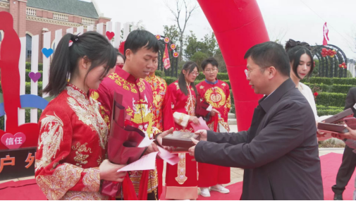 安远县民政局联合县文明办、县妇联、团县委举办“不要彩礼要幸福”集体婚礼,6对新人身穿喜庆的中式婚服,进行了跨火盆、过米筛、共同宣誓等传统婚礼仪式。参加活动的新人纷纷表示:“结婚的意义在于夫妻双方相爱,家庭幸福美满,彩礼对于我们来说并没有那么重要。”