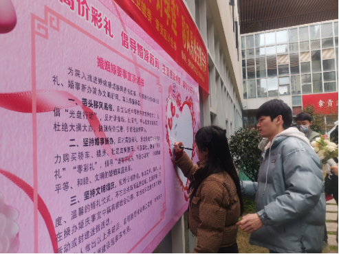 章贡区民政局婚姻登记处向每一对参加活动的新人发放移风易俗倡议书,活动现场设置了“抵制高价彩礼 倡导婚嫁新风”婚姻嫁娶事宜承诺签名墙,刚刚领到结婚证的新人在“签名墙”上“打卡”,并表示要自觉践行新时代青年风采,承诺简办婚礼,引领婚恋新风尚。