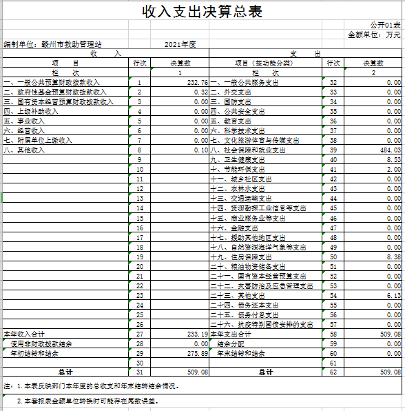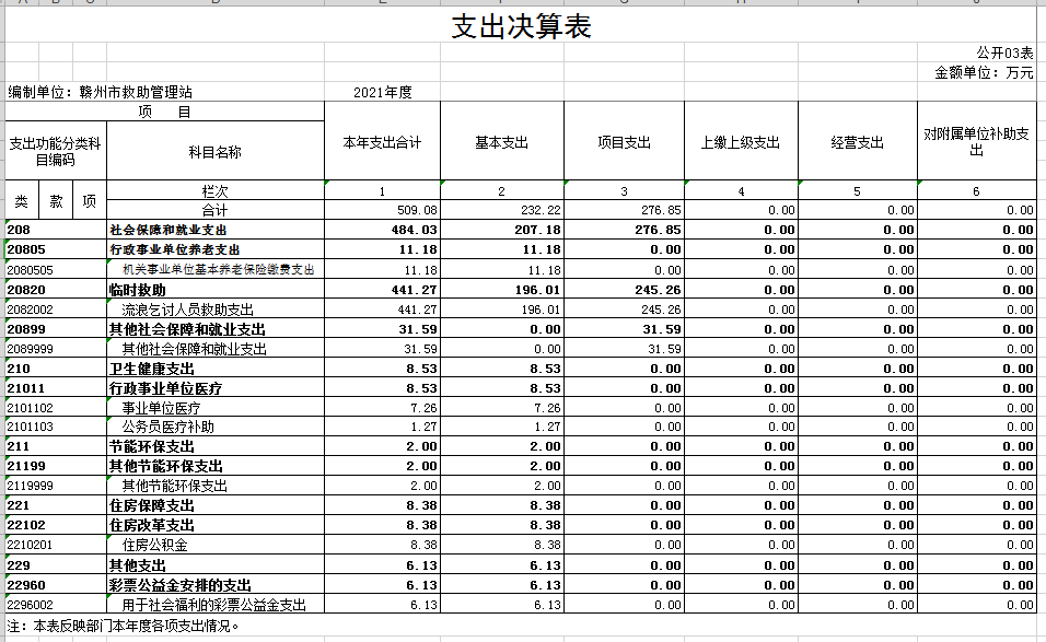 本单位2021年度支出总计509.08万元,其中本年支出合计509.08万元,较2020年减少127.49万元,下降20.03%,主要原因是:因疫情原因,流浪乞讨人员流动减少,救助支出相应减少。;年末结转和结余0万元,较2020年减少987.33万元,下降100%,主要原因是:财政年底收走当年度结余。