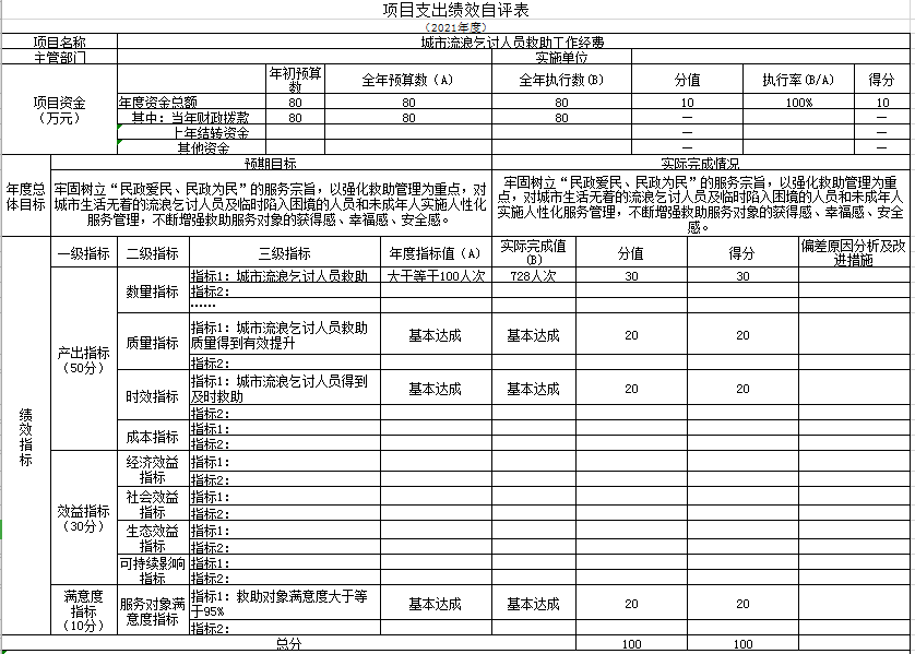 “2021年度城市流浪乞讨人员救助工作经费”项目自评综述:根据年初设定的绩效目标,项目自评得分100分。项目全年预算数为80万元,执行数为80万元,完成预算的100%。项目绩效目标完成情况:牢固树立“民政爱民、民政为民”工作理念,以强化救助管理为重点,对城市生活无着的流浪乞讨人员及临时陷入困境的人员和未成年人实施了人性化服务管理,不断增强救助服务对象的获得感、幸福感、安全感,不断增强全社会对救助工作的认同感、参与感、满意感,得到了上级部门、社会各界赞誉和受助对象的好评。2021年,我站共接待和劝导救助人员728人次,其中:未成年人45人次,精神病人56人次,护送特殊人员(未成年人、精神病人、老年人、残疾人)返乡140人次,医院滞留无名氏精神病人36人,定点托养对象7人。受助人员得到妥善安置,未发生重大责任事故和安全事故,较好地发挥了救助站“稳定器”、“安全网”、“兜底线、救急难”作用。