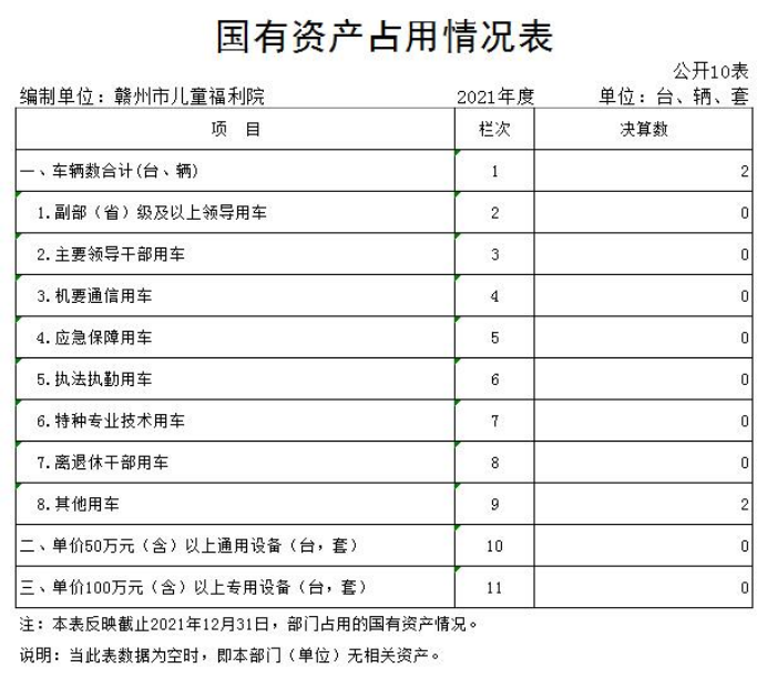 截止2021年12月31日,本单位国有资产占用情况见公开10表《国有资产占用情况表》。其中车辆中的其他用车主要是院内孤残儿童接送及物资运输用车。