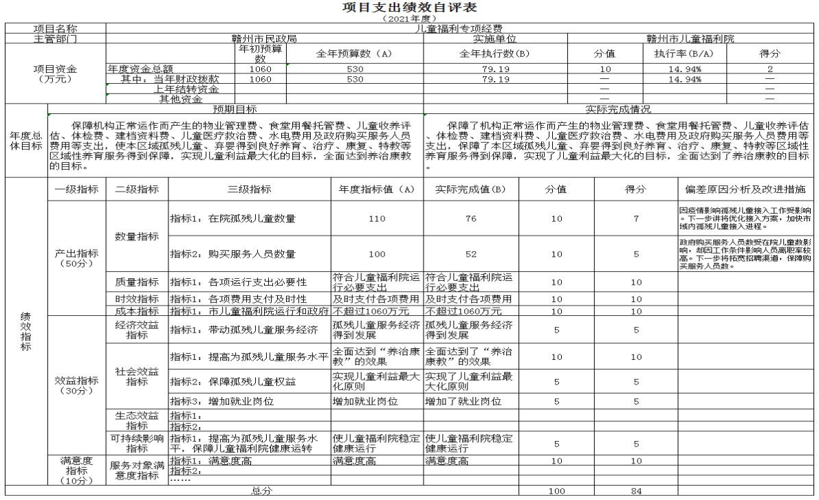 为了进一步加强项目资金的管理,提升财政资金管理科学化、规范化和精细化水平,切实提高财政资金使用效率和效益,根据《365bet体育投_28365-365_365bet娱乐场财政局关于开展 2021 年度市本级预算项目和部门整体支出绩效评价工作的通知》(赣市财评字〔2022〕3 号)文件要求,现对2021年度儿童福利院专项经费项目资金绩效评价工作报告如下: 一、项目基本情况 (一)项目背景及目的 为切实做好我市孤儿区域性机构养育工作,逐步完善孤儿保障体系,根据《365bet体育投_28365-365_365bet娱乐场孤儿区域性机构养育工作实施方案》,我院承担365bet体育投_28365-365_365bet娱乐场域孤残儿童的区域性养育工作。为满足我院儿童养治康教等需求,维持本院工作有序运行开展,特实施此项目。 (二)资金来源及使用情况 2021年度儿童福利院专项经费530万元,其中:当年财政拨款530万元,已使用79.19万元。项目主要用于维持我院运行发生的物业管理费、食堂用餐托管费、儿童收养评估、体检费、建档资料费、儿童医疗救治费、水电费用及政府购买服务人员经费等费用支出。 (三)项目完成情况、组织及管理情况 至2021年底,我院共有院内代养及寄养家庭孤残儿童76人,充分保障了本院运行所需的费用支出,使市儿童福利院的为孤残儿童的服务水平得到了极大提高,推动了市儿童福利院高标准地运转,保障了孤残儿童的权益。 (四)绩效目标 项目的年度目标保障机构正常运作而产生的物业管理费、食堂用餐托管费、儿童收养评估、体检费、建档资料费、儿童医疗救治费、水电费用及政府购买服务人员经费等支出,使本区域孤残儿童、弃婴得到良好养育、治疗、康复、特教等区域性养育服务得到保障,实现儿童利益最大化的目标。 二、绩效评价工作开展情况 (一)绩效评价的目的 通过开展2021年度儿童福利院专项经费项目的绩效评价工作,加强财政资金管理,规范财政支出行为,为今后更合理的安排使用经费、提高资金使用的效益和效率提供决策依据,同时也为我院今后更好的做好绩效评价工作奠定基础。 (二)绩效评价工作方案 根据《365bet体育投_28365-365_365bet娱乐场财政局关于开展 2021年度市本级预算项目和部门整体支出绩效评价工作的通知》(赣市财评字〔2022〕3 号)文件的要求,我院以单位自评的方式,通过核查数据、评判工作实效等程序,开展绩效评价工作并出具评价报告。 (三)绩效评价原则和方法 根据《中华人民共和国预算法》、《中共365bet体育投_28365-365_365bet娱乐场委365bet体育投_28365-365_365bet娱乐场人民政府关于全面实施预算绩效管理的实施意见》(赣市发〔2019〕12 号)等法律法规和文件的要求,绩效评价按照实事求是的原则,利用数据分析、项目实绩评价等方法对项目绩效做出全面的分析评价。 (四)绩效评价的实施 以院班子为绩效评价工作的领导,通过数据分析、项目实绩的评价等方法,对项目的投入情况、项目管理情况、项目产出情况、项目绩效完成度等方面进行细致的核查,利用多种方式综合核查数据,对项目绩效做出评价,并对项目在实施过程中发现的问题提出相应的意见和建议,以进一步完善项目管理制度,建立绩效评价工作档案,最形成成项目绩效评价报告。 (五)绩效评价的局限性 作为新成立单位对于绩效评价工作缺乏经验,绩效评价体系建设需进一步完善。 三、评价结论和绩效分析 (一)评价结论 2021年度儿童福利院专项经费项目的绩效评价得分为84分,该项目保障机构正常运作而产生的物业管理费、食堂用餐托管费、儿童收养评估、体检费、建档资料费、儿童医疗救治费、水电费用及政府购买服务人员经费等相关支出,使本区域孤残儿童、弃婴得到良好养育、治疗、康复、特教等区域性养育服务得到保障,实现儿童利益最大化的目标,很大程度上完成了年度绩效目标。 (二)绩效分析:项目决策、项目管理、项目绩效、成本构成分析 该项目根据《365bet体育投_28365-365_365bet娱乐场孤儿区域性机构养育工作实施方案》的要求以及365bet体育投_28365-365_365bet娱乐场孤残儿区域机构养育工作人员的实际需求数制定项目决策并制定切实可行的实施方案,项目管理上不存在滞拨、截留、挤占、挪用、虚列支出等违规情况,符合相关的预算财务管理制度。项目通过保障了市儿童福利院运行的必要支出,提高福利院服务水平,充分保障了全市孤残儿童权益,推动了365bet体育投_28365-365_365bet娱乐场儿童福利院高标准运营。 项目2021年度实际支出79.19万元,主要用于儿童福利院正常运行所需的各项支出。年度实际支出与预算数相差较大原因为2021年受新冠肺炎疫情影响,我院新接入孤残儿童计划暂缓,相关工作暂延进行,相关支出受限。我院将在接入孤残儿童条件成熟的情况下加速推进工作开展。 四、绩效评价指标分析 (一)项目决策情况 我院负责365bet体育投_28365-365_365bet娱乐场地区区域性机构养育工作,承担本区域孤残儿童的养育、治疗、康复、特教等工作。为保障全区域内拟接收的孤残儿童工作的开展,维持机构正常运作产生的物业管理费、食堂用餐托管费、儿童收养评估、体检费、建档资料费、儿童医疗救治费、水电费用及政府购买服务人员费用等支出需求,特开展此项目。 (二)项目过程情况 项目按时按需保障了儿童福利院运行产生的物业管理费、食堂用餐托管费、儿童收养评估