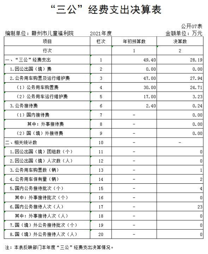(二)公务接待费支出年初预算数为2.4万元,决算数为 0.24万元,完成预算的10%,决算数较2020年减少0.04万元,下降14.29%,主要原因是坚持过紧日子,严控一般性支出,从严控制“三公”经费。决算数较年初预算数减少的主要原因是:坚持过紧日子,严控一般性支出,从严控制“三公”经费。全年国内公务接待4批,累计接待23人次,其中外事接待0批,累计接待0人次,主要为:儿童福利工作接待事项。