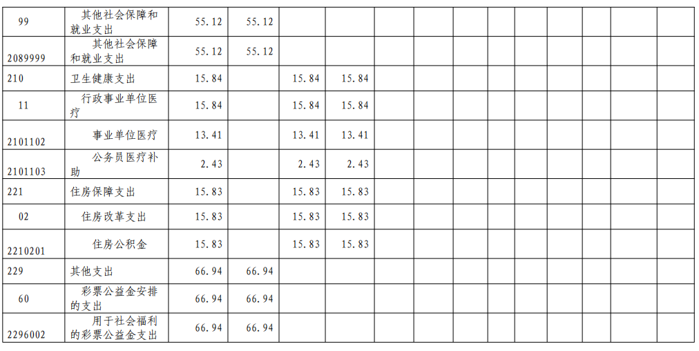 按支出功能科目划分:社会保障和就业支出608.28万元,卫生健康支出15.84万元,住房保障支出15.83万元。