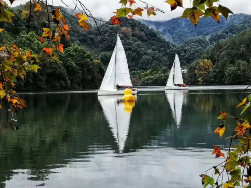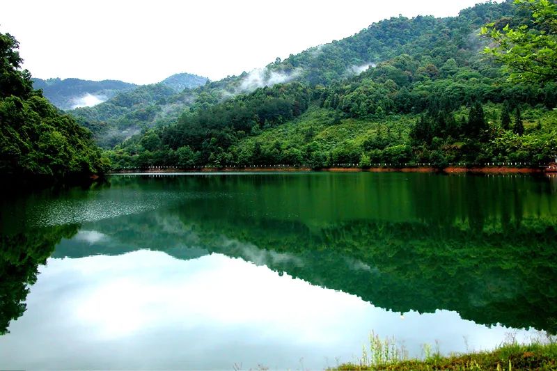 阳明湖 青山不墨千秋画,绿水无弦万古琴。与苍翠同样令人陶醉的,是阳明山的灵动。阳明湖就静静地匍匐在山脚。湖面弥弥浅浪,横空隐隐层霄,山中翠绿倒满整个湖面,宛如碧玉镶嵌。