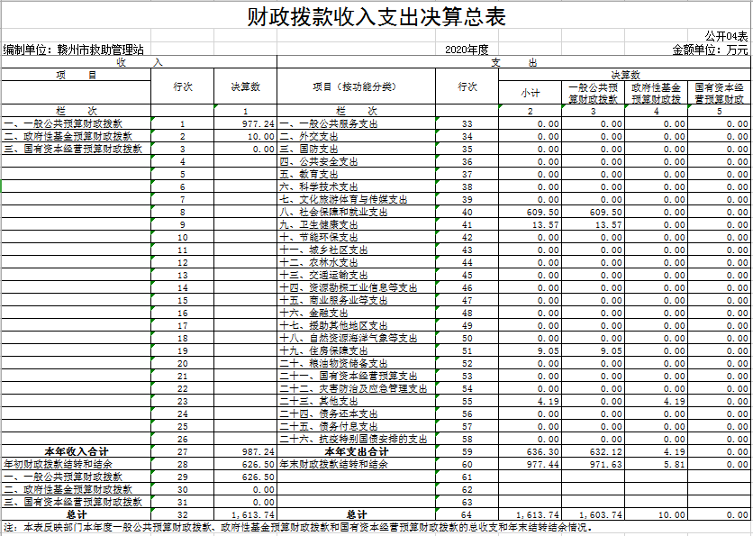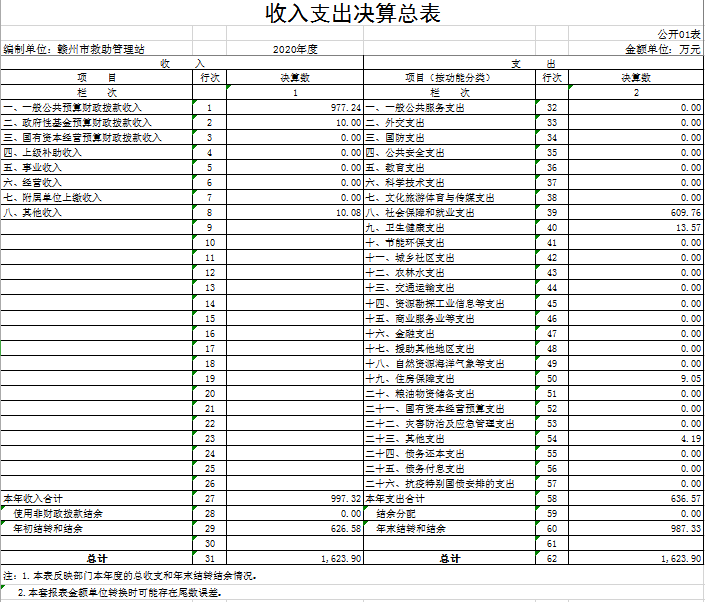 本站2020年度收入总计1623.90万元,其中年初结转和结余626.58万元,较2019年增加352.40万元,增长27.72%;本年收入合计997.32万元,较2019年减少74.76万元,下降6.97%。主要原因是:本年度一般公共预算财政拨款减少。
