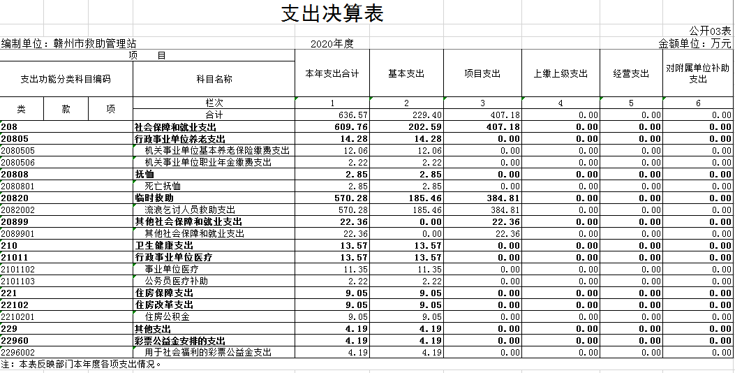 本站2020年度支出总计1623.90万元,其中本年支出合计636.57万元,较2019年减少8.35万元,下降1.29%;年末结转和结余987.33万元,较2019年增加360.75万元,增长57.57%。主要原因是:因疫情原因,流浪乞讨人员流动减少,救助支出相应减少。