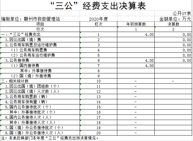 本站2020年度“三公”经费支出年初预算数为4万元,决算数为0万元,完成预算的0%,决算数较2019年减少0.38万元,下降100%,其中: